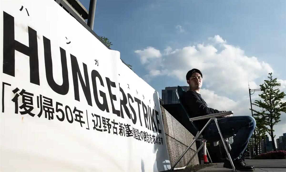 今年5月9日,前冲绳县公投代表本山真四郎(Jinshiro Motoyama)在日本首相办公室外放置了一面横幅,宣布开始绝食抗议。