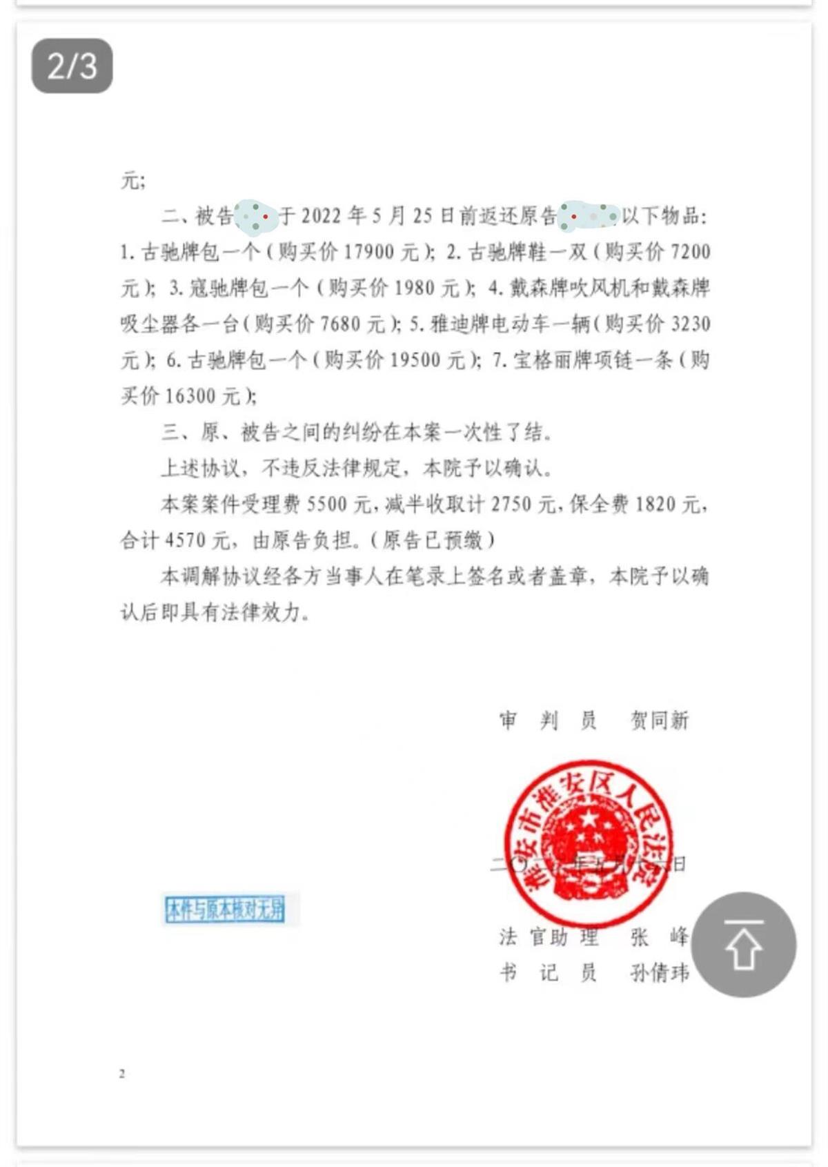 本案在审理过程中,经本院主持调解,当事人自愿达成如下协议:文小姐于2022年5月25日前,返还曾先生现金32285元;返还曾先生以下物品:1、某品牌包一个(购买价17900元); 2、某品牌鞋一双(购买价7200元); 3、某品牌包一个(购买价1980元);4、某品牌吹风机和戴森牌吸尘器各一台(购买价7680元); 5、某品牌电动车一辆(购买价3230元);6、某品牌包一个(购买价19500元);7、某品牌项链一条(购买价16300元)。原、被告之间的纠纷在本案一次性了结。本案受理费5500元,减半收取计2750元,保全费1820元,合计4570元,由原告负担。