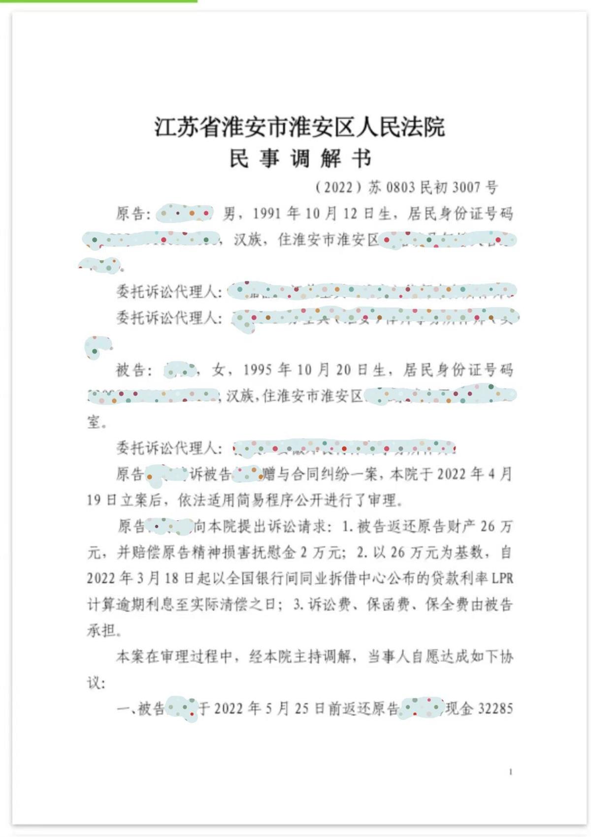 江苏当地法院5月16日出具的《民事调解书》载明:曾先生诉文小姐赠与合同纠纷一案,本院于2022年4月19日立案后,依法适用简易程序公开进行了审理。