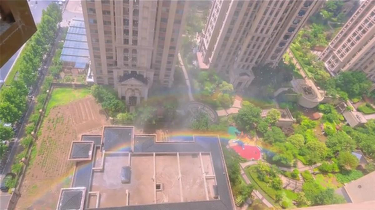 “我和孩子都挺期待的。”段女士说,上午11时10分左右,各楼栋的楼顶开始喷出水瀑,给小区浇了一个“凉水澡”。整个过程持续约20分钟,期间还出现了彩虹。虽然不知这人工降雨带来的降温效果能持续多久,但确实能让人从心里感到“清凉”。