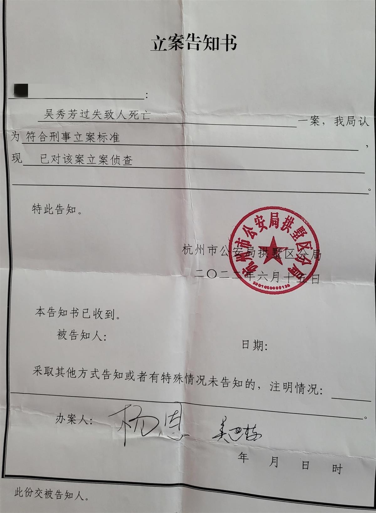 目前,根据陈先生提供的《立案告知书》,杭州市公安机关已经对保姆吴某过失致人死亡案进行立案侦查。