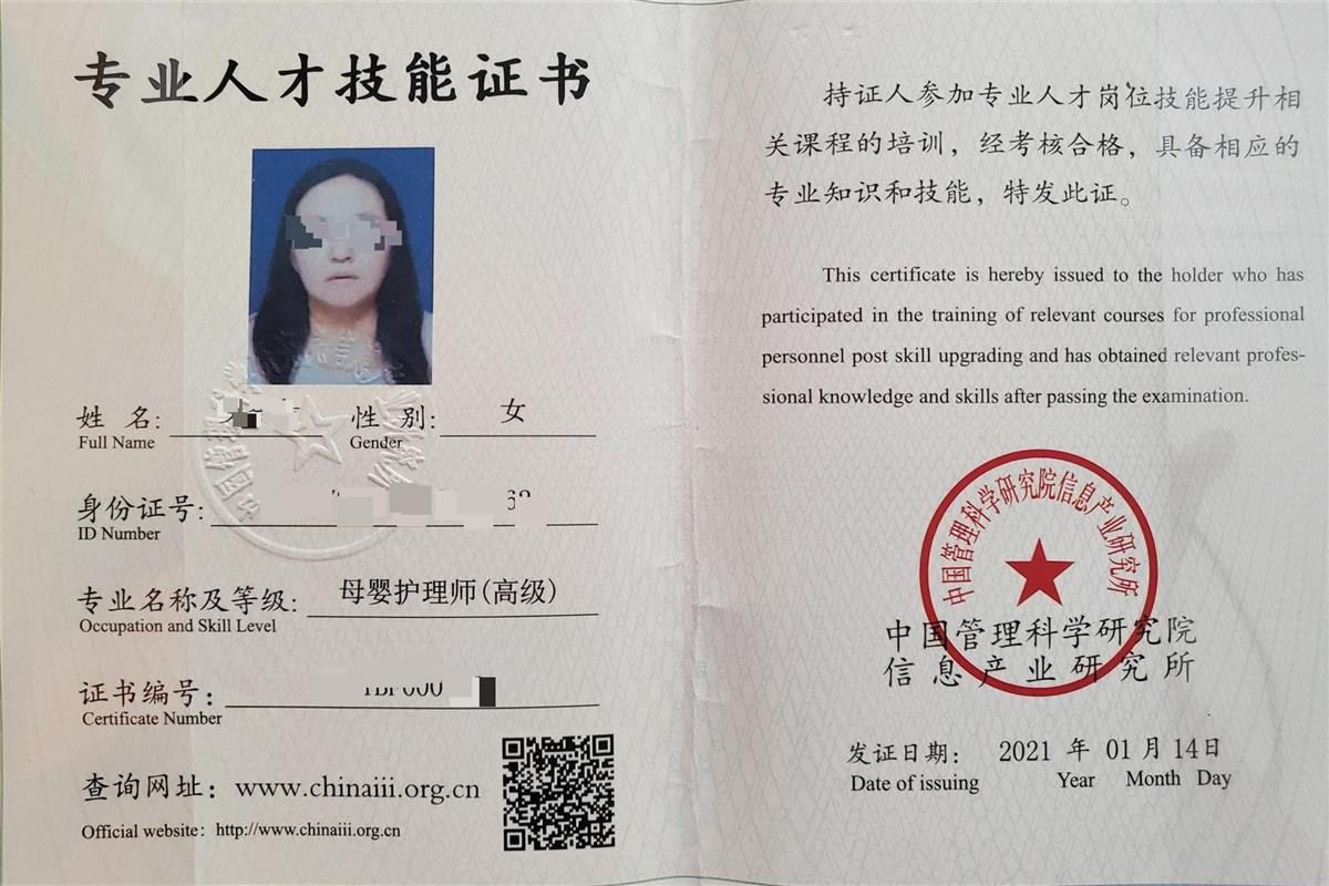 证书内容显示,保姆吴某1974年生,其在2021年1月14日拿到该证件,专业名称和等级为“母婴护理师(高级)”,发放机构为中国管理科学研究院信息产业研究所。