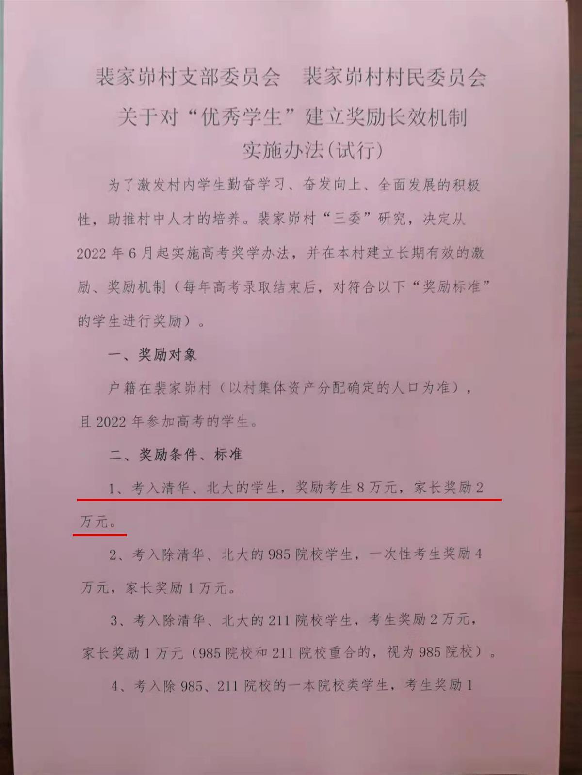 该村一位村民发给记者的奖励方案通知显示,奖励对象为户籍在裴家峁村的初、高中学生和高考被高等院校录取的优秀学生。其中,考入清华、北大的学生,给考生奖励8万元,给家长奖励2万元;考入除清华、北大外的985院校学生,考生奖励4万元,家长奖励1万元;考入211院校的学生,给考生奖励2万元,给家长奖励1万元;考上一本的,考生奖励1万元。另外,初、高中每学年度考试成绩达到全县前十名的,也分别奖励2000元和5000元。