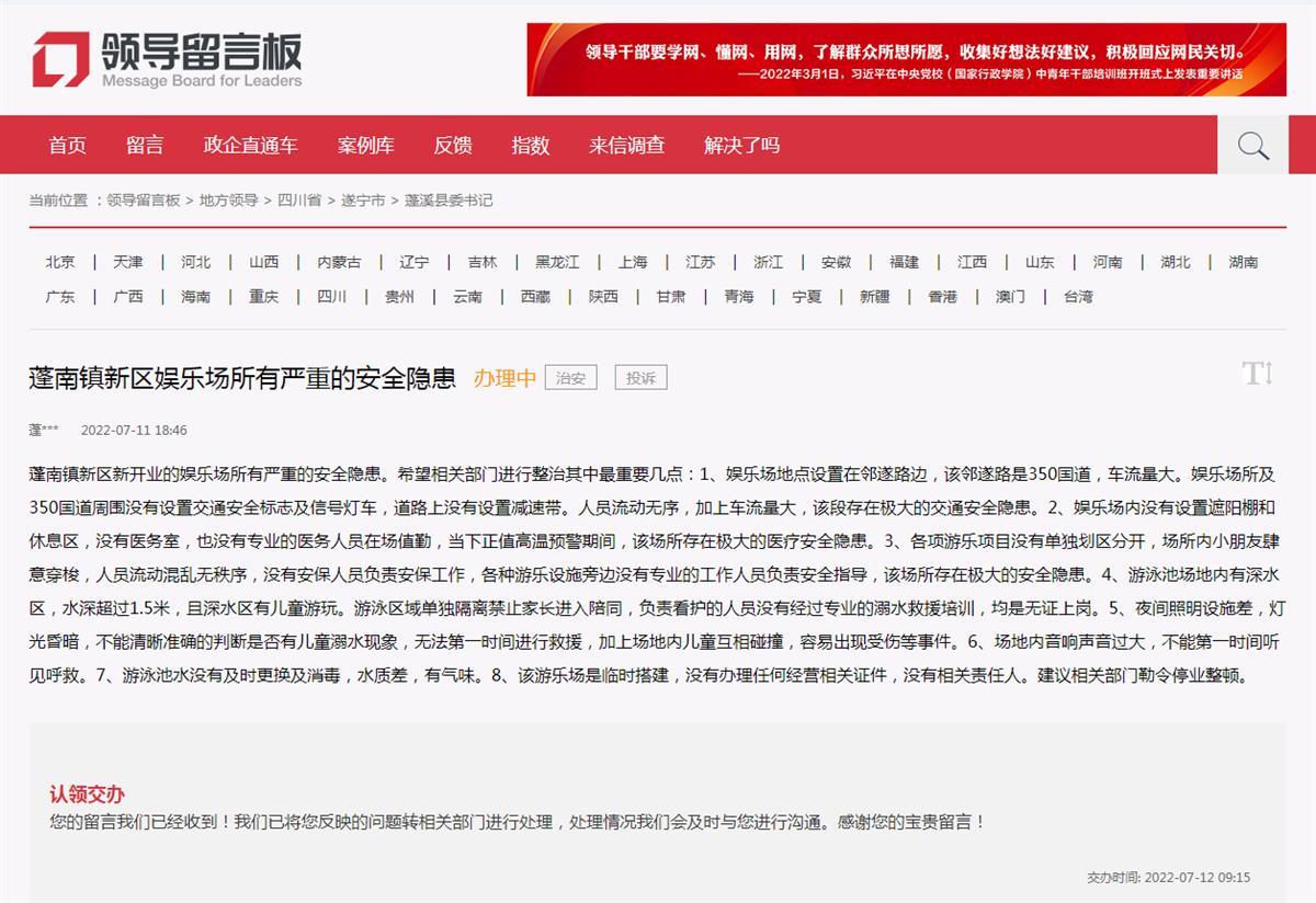 极目新闻记者注意到,7月11日18时46分,有网友在《人民网》的《领导留言板》上投诉称,蓬南镇新开业的新区娱乐场所有严重的安全隐患。具体表现在该娱乐场所存在极大的交通安全隐患、医疗安全隐患、游泳池看护人员无证上岗、容易出现受伤等事件、游泳池水质差、游乐场是临时搭建未办理任何经营相关证件等方面,该网友建议相关部门勒令停业整顿。