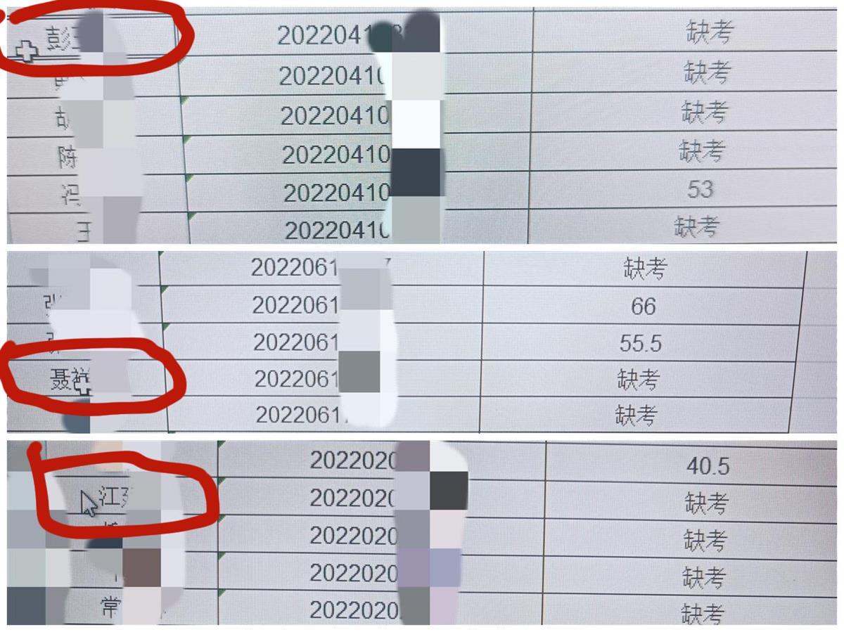 考生的笔试成绩,其中江某某、彭某某、聂某某“缺考”,却依然进入面试名单 (图源:祥符区人民政府官网)