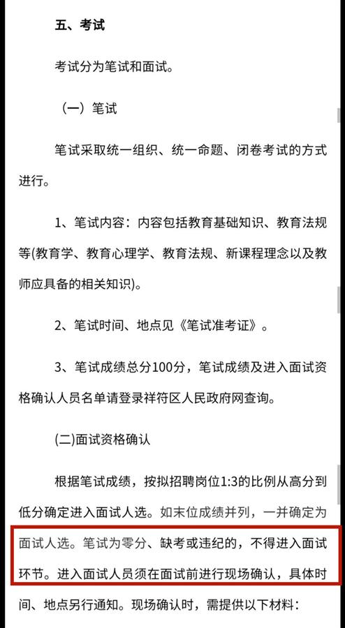 2021年开封市祥符区公开招聘教师简章明确规定,笔试缺考不得进入面试环节 (图源:祥符区人民政府官网)