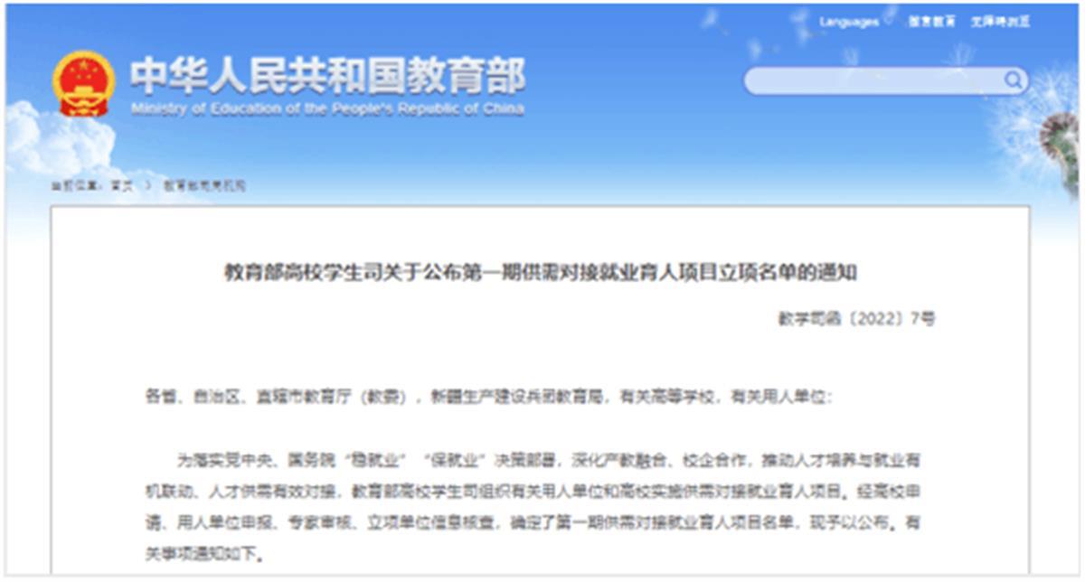 为落实党中央、国务院“稳就业”“保就业”决策部署,深化产教融合、校企合作,推动就业与培养有机联动、人才供需有效对接,帮助用人单位培养和招聘更多实用型、复合型和紧缺型人才,促进高校毕业生更加充分更高质量就业,教育部今年首次实施供需对接就业育人项目。