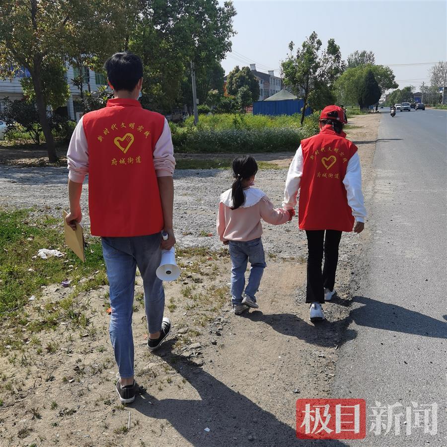 三人发现欣欣时,她已从安陆市洑水镇老家步行了10余公里,而她的爸爸妈妈工作的地方,距离她家足有20公里左右,此时汗水混着泪水打湿了她的脸颊,头发也有些凌乱。