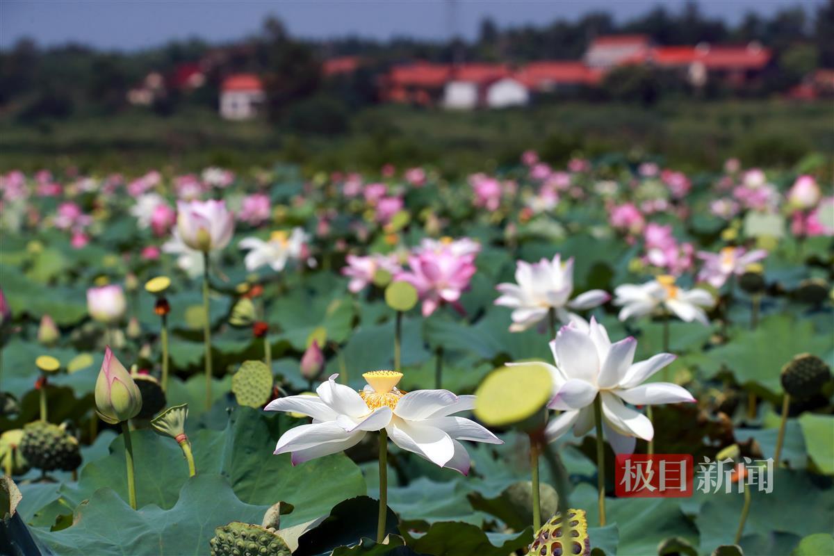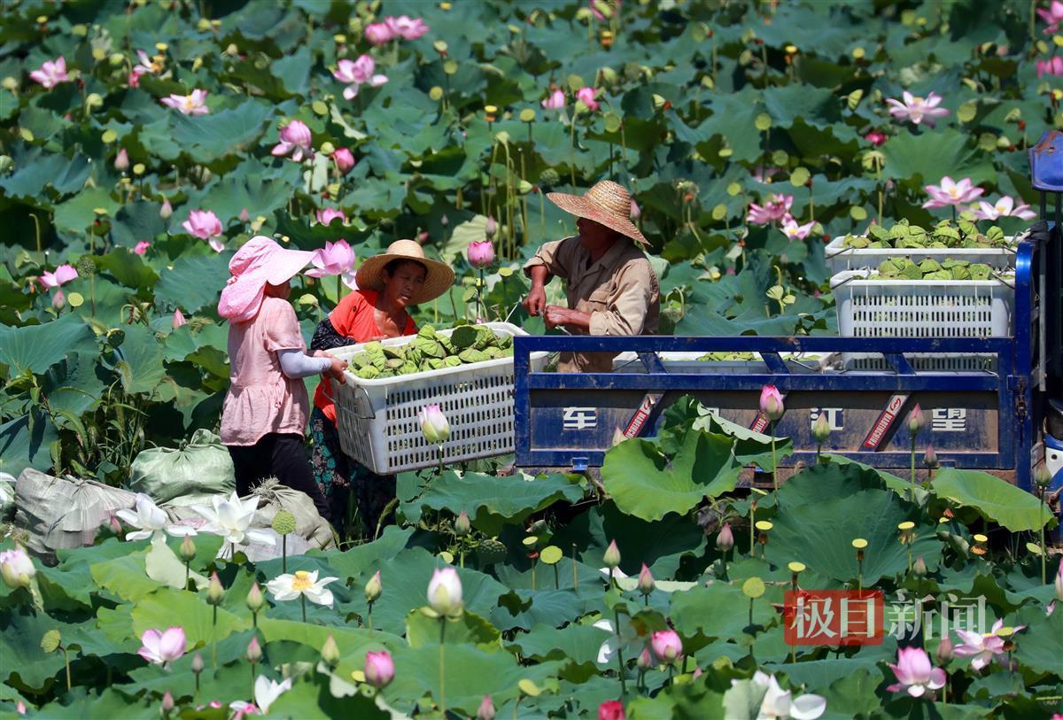 盛夏时节,湖北省鄂州市梁子湖区涂家垴镇的万亩荷塘内,片片荷叶高低错落、朵朵荷花亭亭玉立,美不胜收,莲蓬已到采摘期。7月25日,村民们顶着烈日钻进荷塘,开启了莲蓬丰收季。据了解,涂家镇立足湖泊特色资源和优势,产出荷花、莲蓬、莲藕,是当地村民增收的特色种植业之一。