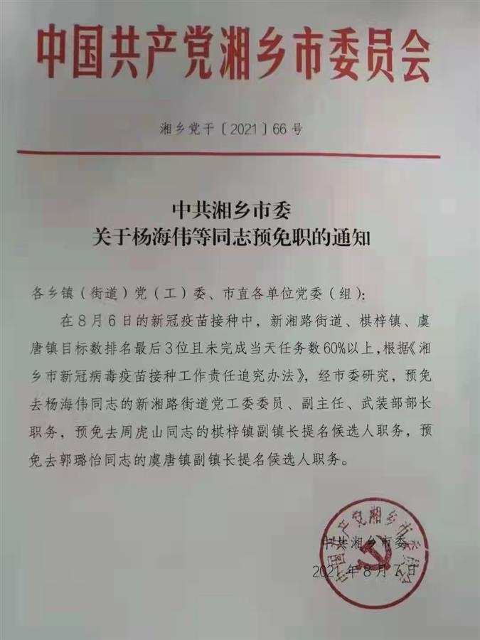 另一份网传通知落款时间为8月7日。通知称,在8月6日的新冠疫苗接种中,新湘路街道、棋梓镇、虞唐镇目标数排名最后3位且未完成当天任务数60%以上,根据《湘乡市新冠病毒疫苗接种工作责任追究办法》,经市委研究,预免去杨海伟同志的新湘路街道党工委委员、副主任、武装部长职务,预免去周虎山同志的棋梓镇副镇长提名候选人职务,预免去郭璐怡同志的虞唐镇副镇长提名候选人职务。