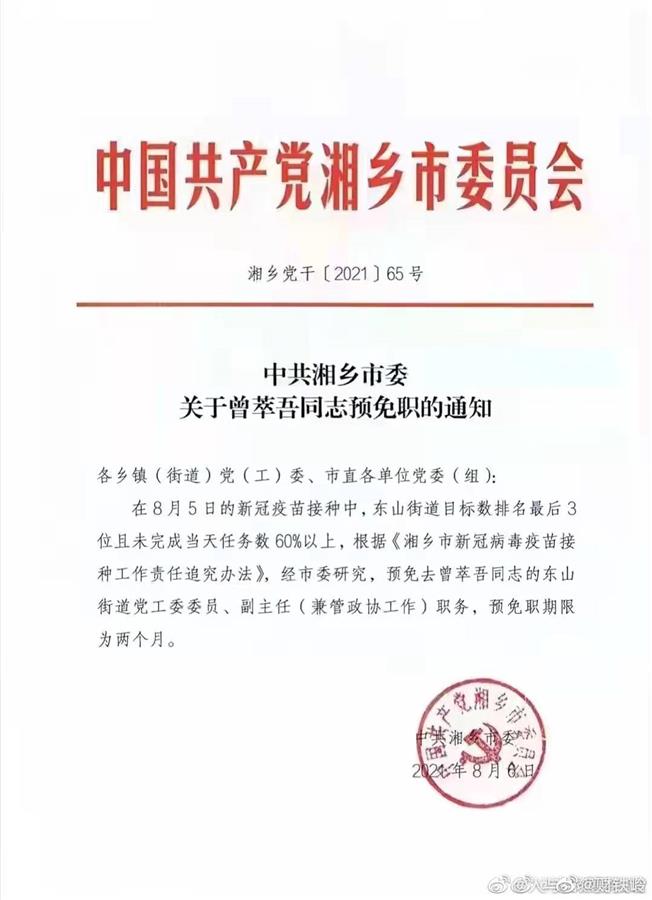 网传的一份《中共湘乡市委关于曾萃吾同志预免职的通知显示》,在8月5日的新冠疫苗接种中,东山街道目标数排名最后3位且未完成当天任务数60%以上,根据《湘乡市新冠病毒疫苗接种工作责任追究办法》,经市委研究,预免去曾萃吾同志的东山街道党工委委员、副主任(兼管政协工作)职务,预免职期为两个月。该通知落款时间为8月6日。