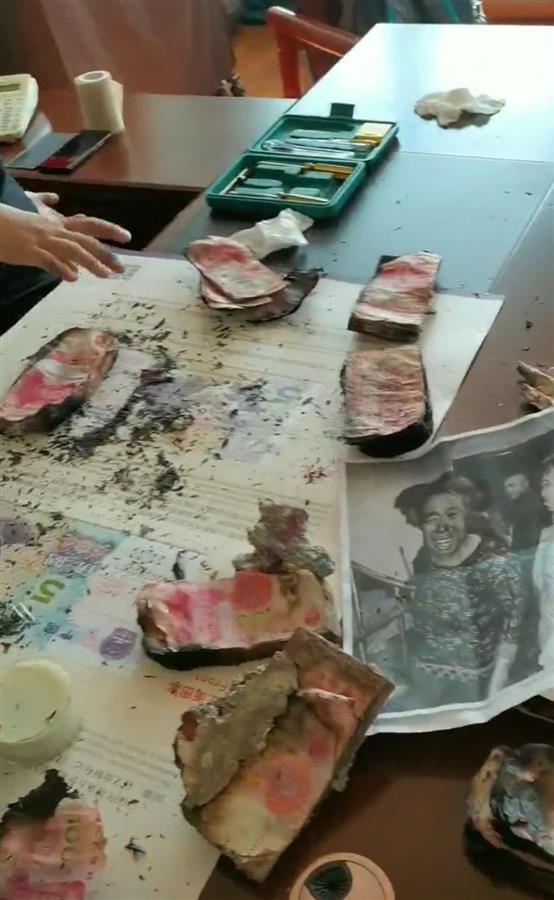 在当地居民提供的视频中可以看到,放在桌子上的几摞百元大钞,边缘部位均有不同程度损毁,有明显过火的痕迹。