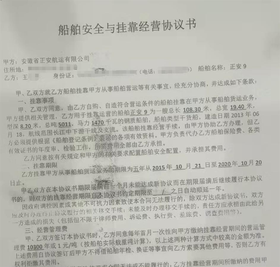 极目新闻记者获取的一份船舶安全与挂靠经营协议书显示,“正安9”建造于2013年6月,总长108.3米,总宽19.4米,型深8.2米,总吨5011,航线范围为长江中下游干线及支流。这份协议书显示,安徽省正安航运有限公司(下称“正安公司”)作为甲方,一王姓男子作为乙方,“正安9”被乙方用于挂靠在甲方从事船舶货运业务,甲方提供相关管理。船舶挂靠经营手续由甲方协助乙方办理。挂靠时间从事船舶货运业务的期限为2015年10月至2020年10月。