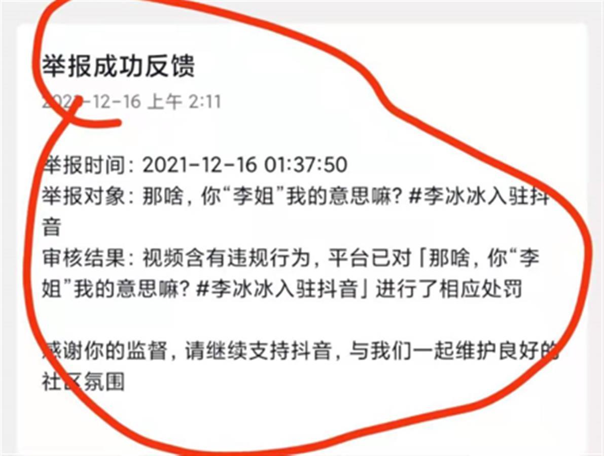 “我当时看到她的视频,就觉得她的穿着不得体,过于暴露,我是儿科医生,和孩子接触得比较多,担心作为公众人物穿着过于暴露,会对青少年产生不良影响,有错误引导。”举报人马先生说,他对李冰冰视频的举报顺利通过了视频平台的审核。平台给予的回复是视频确含有违规行为,已对其进行处罚。