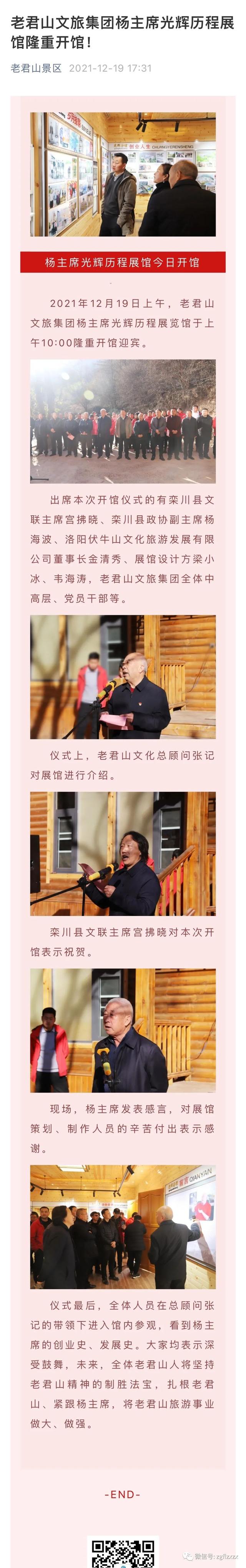 20日上午,极目新闻搜索该景区公众号,发现该文已经撤下。网友所保存的文章截图显示,2021年12月19日上午,老君山文旅集团杨主席光辉历程展览馆于上午10时隆重开馆迎宾。文章在结尾还表示,看到杨主席的创业史、发展史。大家均表示深受鼓舞,未来,全体老君山人将坚持老君山精神的制胜法宝,扎根老君山、紧跟杨主席,将老君山旅游事业做大、做强。
