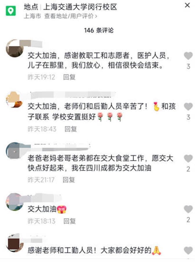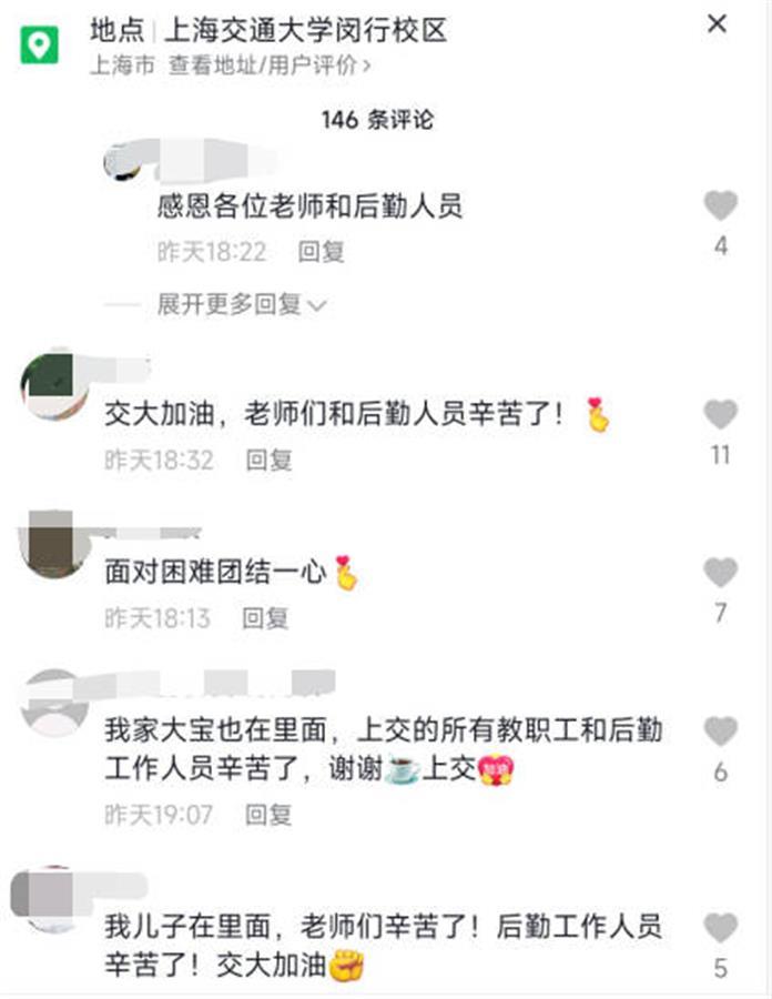 上述视频发布后,网友纷纷点赞留言,不少学生家长在感动之余,评论道:“交大加油,感谢教职工、志愿者和医护人员,孩子在里面,我们放心,相信疫情很快就会过去。”还有学生留言表示:“感谢交大所有的付出者,谢谢老师们,相信在大家的共同努力下,一切困难都会被克服。”