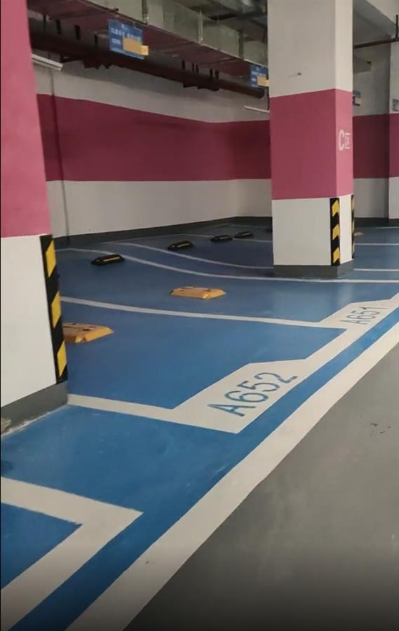 拍摄于9日下午1时许的视频显示,在一个地下车库里,编码A651至A654附近的停车位地面崎岖不平,有些车位的后方隆起了一个大包,墙上的红色识别线也不是平直的。