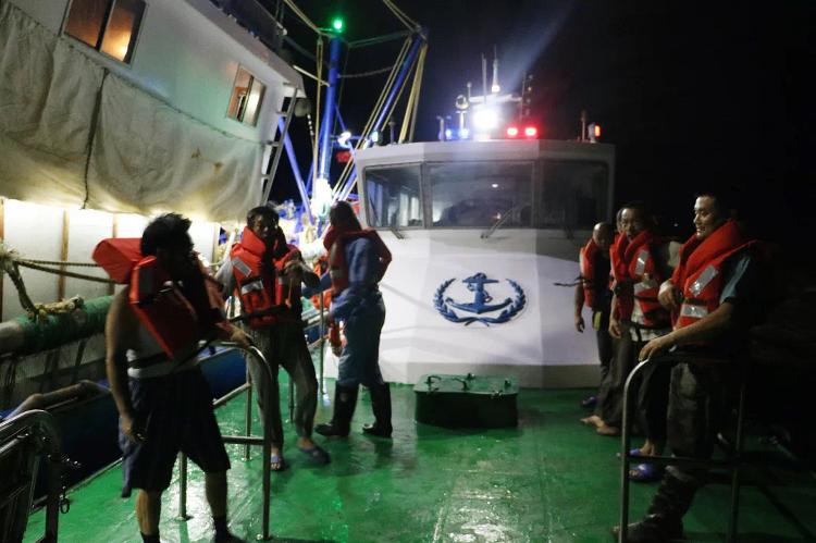 “海巡01083”轮航行15海里到达附近水域,海事工作人员在做好现场水域安全评估后,谨慎驾驶巡逻艇靠泊“沪崇渔110XX”轮,并顺利将遇险渔船上9名被困船员安全转移至巡逻艇上,“苏常工001”轮守护。