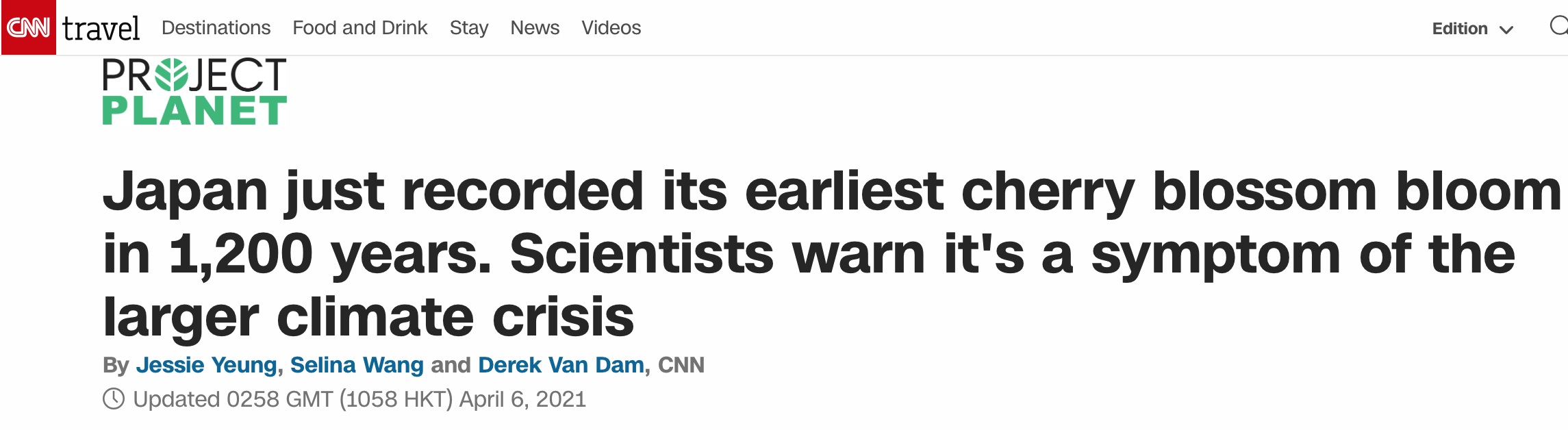 据美国有线电视新闻网(CNN)当地时间4月6日报道,今年日本的樱花季来得比往年都要早,且于三月下旬在多市达到“峰值”(即70%的樱花都已绽放);如此提前,可谓千年难遇。然而,看似美好景象的背后掩藏着一个残酷的事实:更严重的气候危机正在逼近。