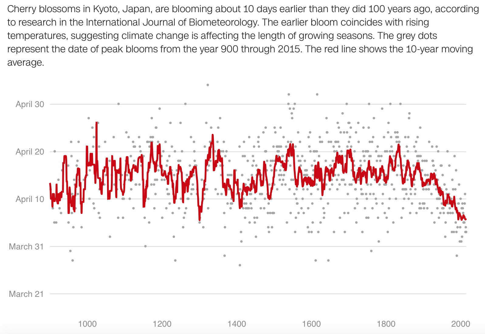 △千年来,日本京都樱花“峰值”日的波动深受气候变化的影响。(图片来源:CNN/《国际生物气象学杂志》)