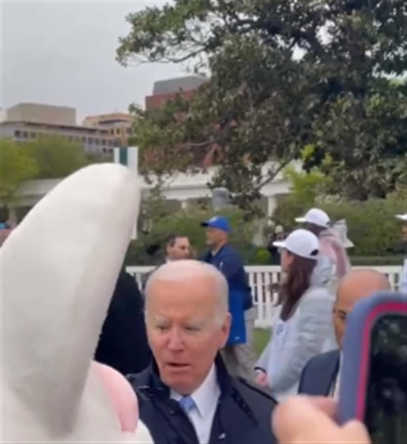 这时,一个巨大的白色“复活节兔子”人偶突然靠近拜登,拜登吃了一惊,张大了嘴,周围的人笑着喊:“复活节兔子!”