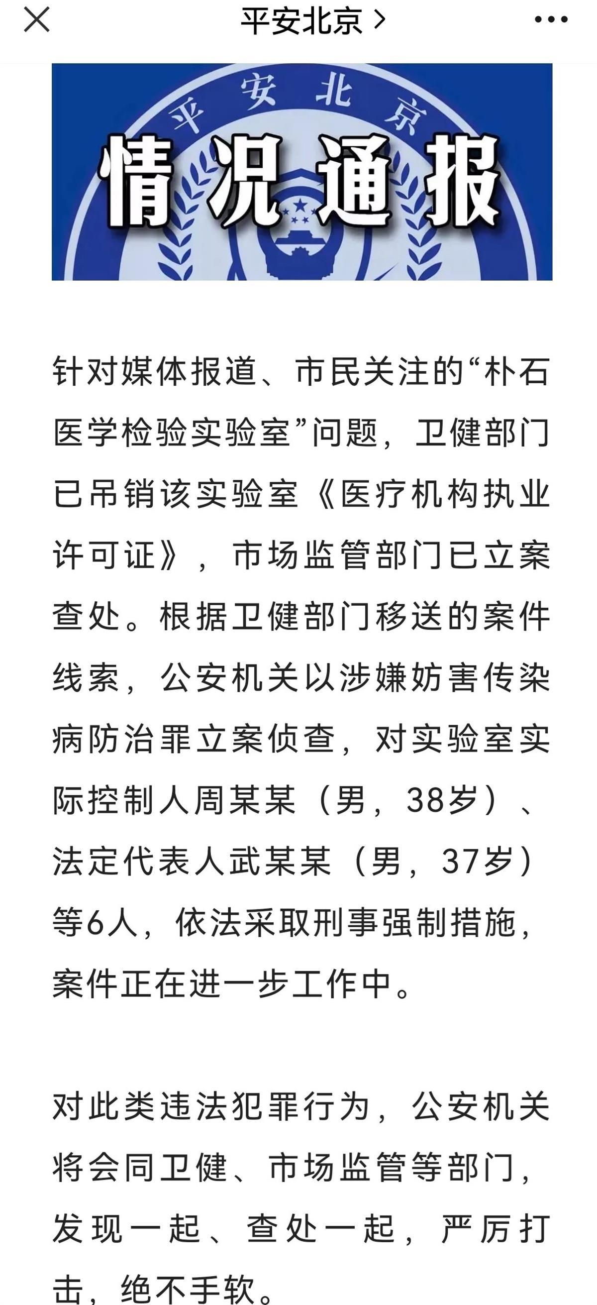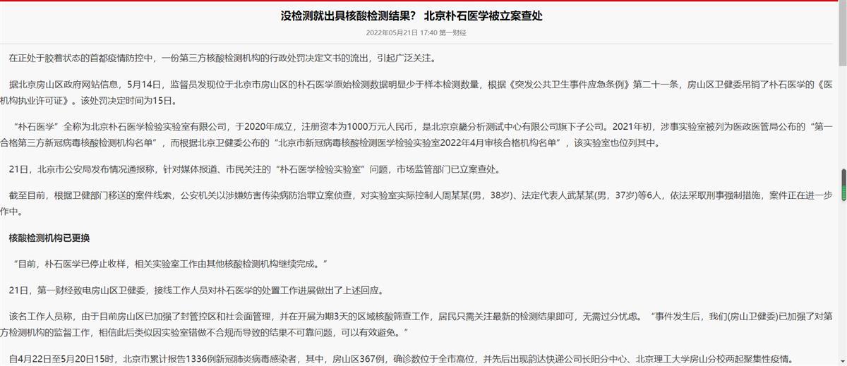5月14日,位于北京市房山区的核酸检测实验室朴石医学,被发现原始检测数据明显少于样本检测数量,引发媒体和市民关注。5月21日,北京市疫情防控发布会上公布,卫健部门已吊销该实验室《医疗机构执业许可证》,市场监管部门已立案查处,公安机关已对实验室实际控制人周某某、法定代表人武某某等6人,依法采取刑事强制措施,案件正在进一步工作中。(据5月22日北京晚报)