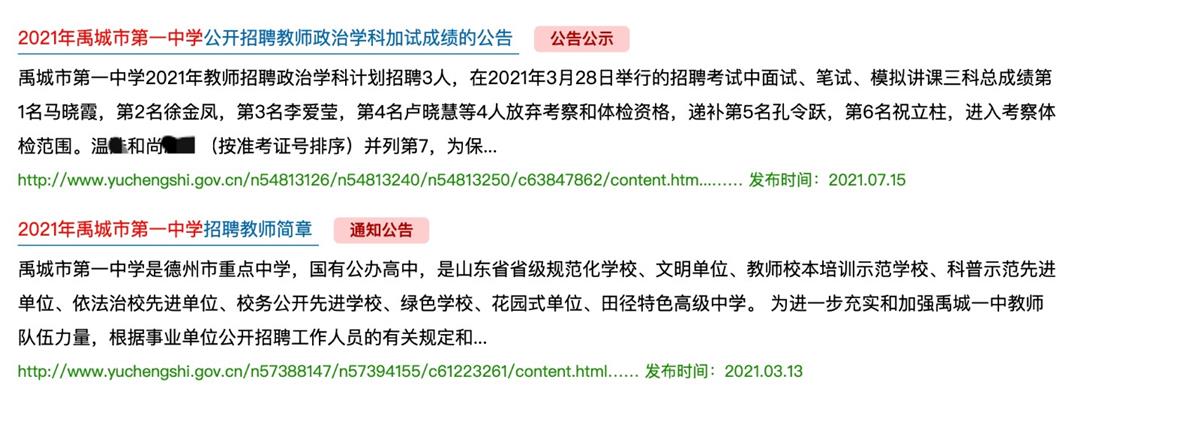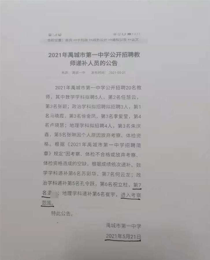 5月21日,禹城一中公开发布了一份《2021年禹城市第一中学公开招聘教师递补人员的公告》。公告说明,因考察、体检不合格或放弃考察等原因造成的空缺,根据成绩依次递补。政治学科递补第5名孔某某、第6名祝某某和第7名温某。