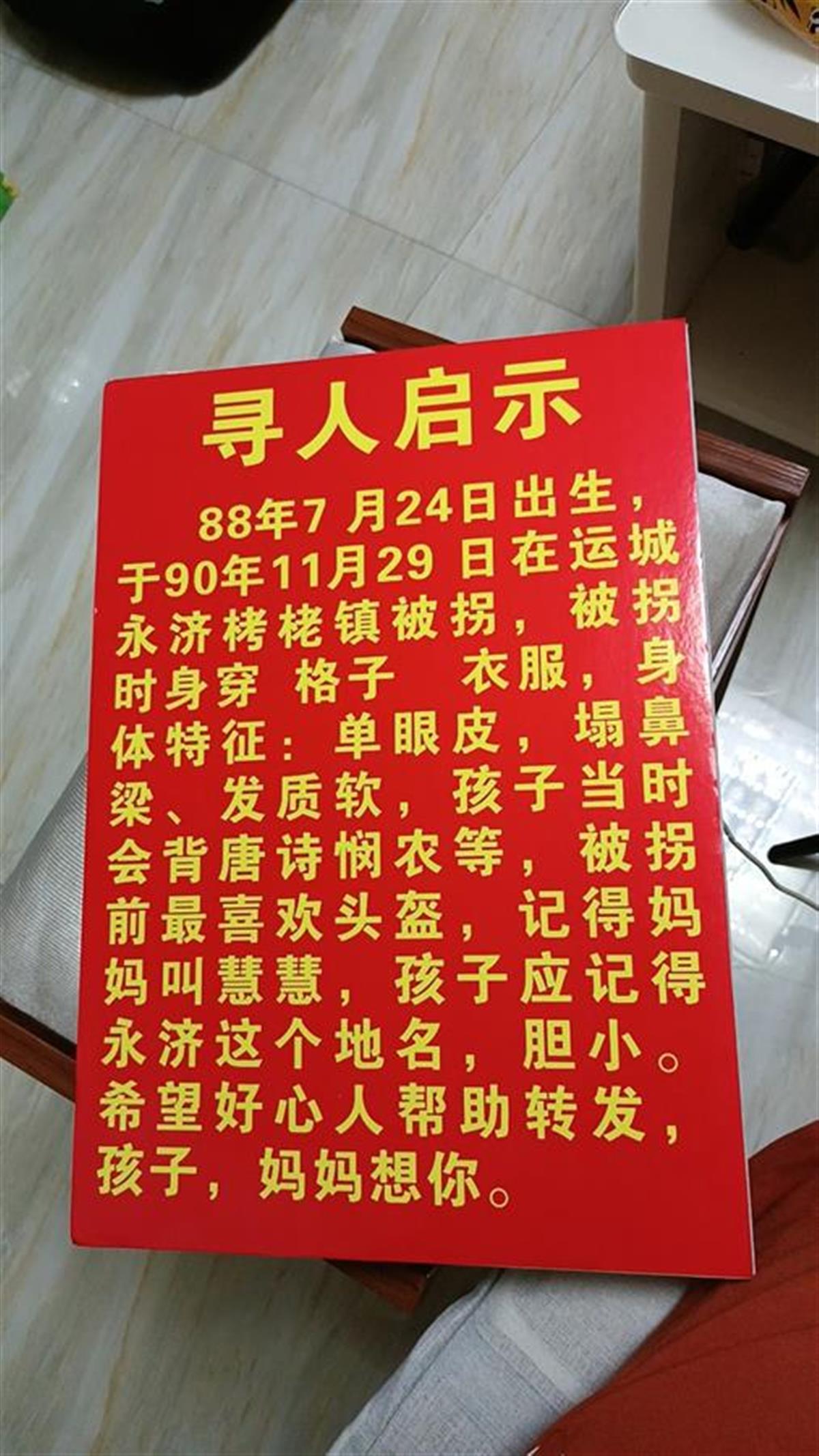 张慧告诉记者,直到现在,孩子奶奶还活在自责中,老人家年近八十还在打工攒钱,想等找到孩子后弥补他。每次举起儿子的寻人启事,她就感觉自己的伤口被撕开,难以抑制自己想哭的情绪。目前,她和姬岩父亲都采血入库了。儿子姬岩小时候是单眼皮塌鼻梁,但她已经想象不到儿子现在的样子。儿子失踪已31年,进入第32个年头,她想按年份写32封信,如果儿子也在找她,她也许能勾起儿子的回忆,让儿子看到每一年家中的变化,看到母亲是怎么在找他。