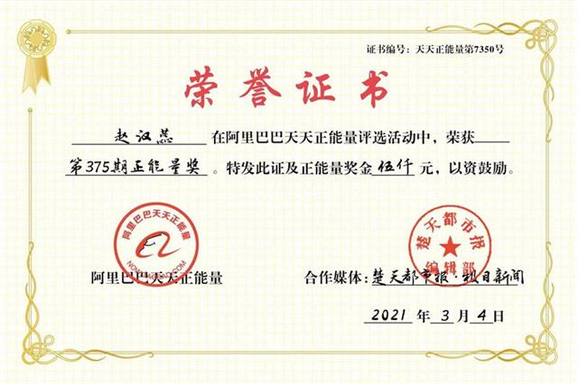 “天天正能量”是阿里巴巴集团联合楚天都市报在内的100多家主流媒体共同打造的大型公益开放平台,以“传播正能量、弘扬真善美”为宗旨,面向全社会寻找、奖励凡人善举。目前,天天正能量已奖励8000余名正能量人物,投入公益金7000多万元。此前,楚天都市报报道的18年前冒险爬楼救人的李向阳、街头飞奔截停轿车的辅警付波、照顾摔伤邻居的好大姐汪兰、社区爱心送餐妈妈团体等湖北正能量人物都曾获得该奖励。