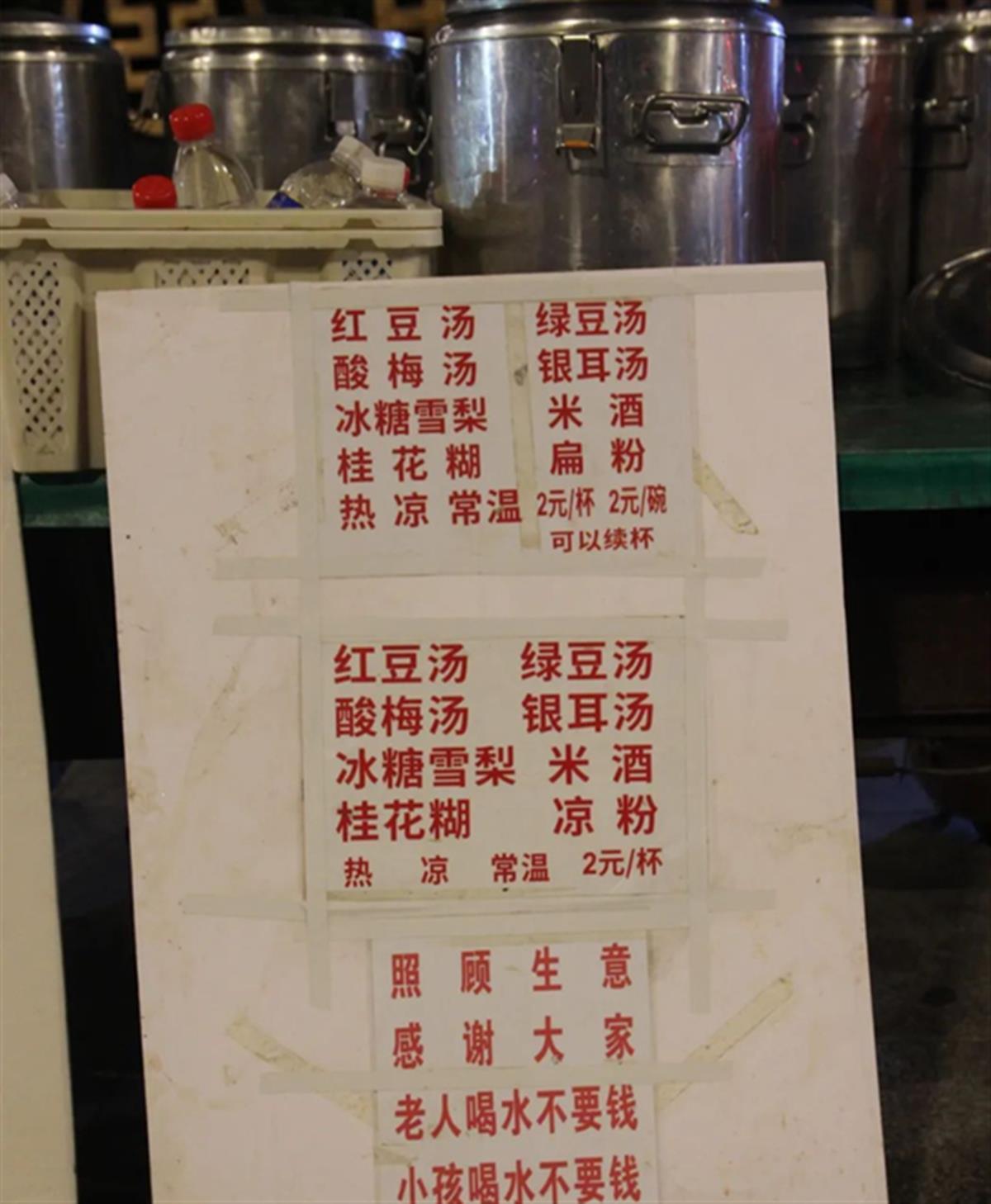 红豆汤、绿豆汤、酸梅汤、银耳汤、冰糖雪梨、米酒、桂花糊……很家常的味道,很丰富的种类,这么些糖水,每天光制作都得费不少功夫。但是老人17年来坚持卖 2元1份不涨价,还可以免费无限续杯,而且老人、小孩都不收钱,让人忍不住感慨:真的能赚到钱吗?老人的回应是:“不图赚钱,喝好就行。”