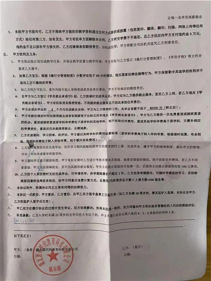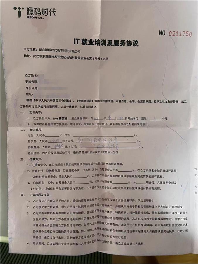 “培训协议上白纸黑字写着‘包就业’,毕业后‘首薪不低于6000元’,学完就变了,只是帮着包装简历,没有推荐一个工作!”9月21日,武汉市民李女士向极目新闻热线(027-86777777)反映:自己花了近2万块给孩子报名IT培训,但从3月份结业至今,机构未兑现推荐工作的承诺,如今想要退费却遭拒。