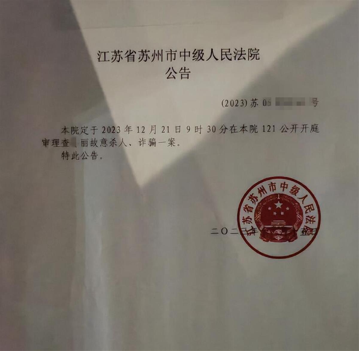12月20日晚,极目新闻记者在苏州中院公告栏看到,该院12月15日发布公告称,定于12月21日9时30分在该院121公开开庭审理查某丽故意杀人、诈骗一案。