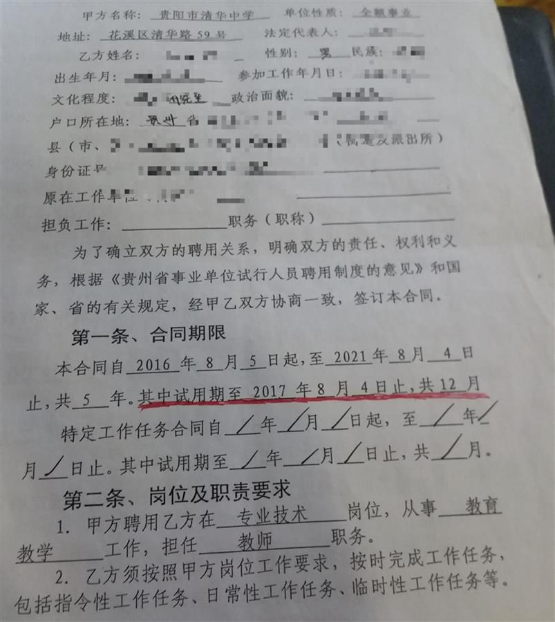 “2017年6月,我收到一所高校的入职邀请,就向贵阳市清华中学领导申请调离。校方称如果要调离,需要支付12万元违约金,才能办调离手续和人事档案关系转移。”杨冈说,他当时刚参加工作不久,每个月收入不高,且家里经济条件有限,于是便继续留在贵阳市清华中学工作。