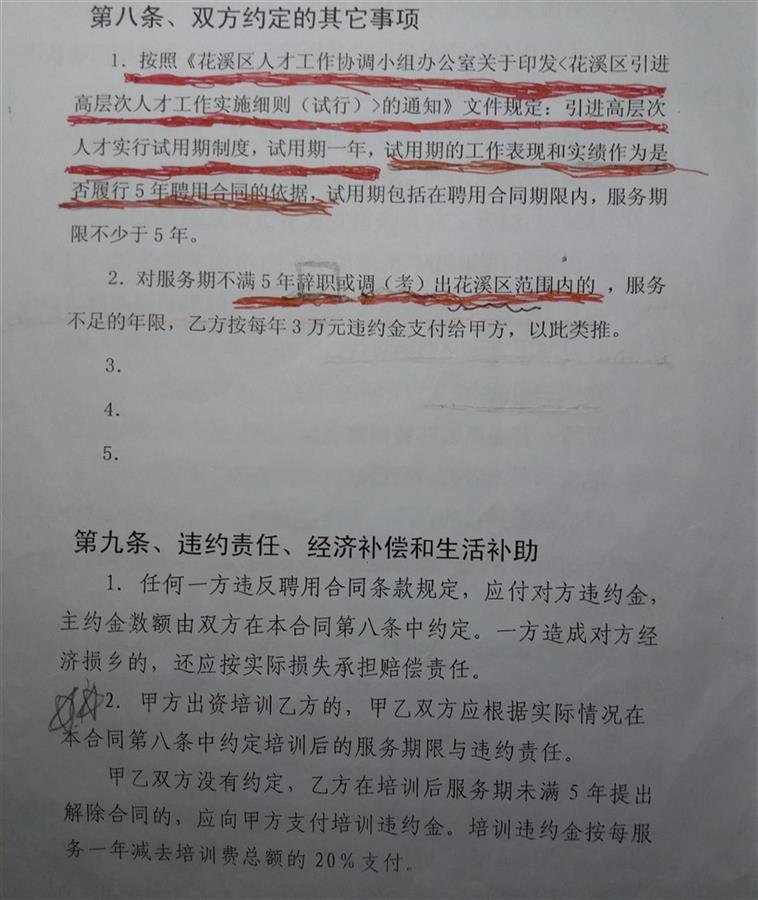 极目新闻记者从杨冈签订的《聘用合同书》第八条中看到,按照《花溪区人才工作协调小组办公室关于印发花溪区引进高层次人才工作实施细则(试行)的通知》文件规定,引进高层次人才实行试用期制度,试用期一年,试用期的工作表现和实绩,作为是否履行5年聘用合同的依据,试用期包括在聘用合同期限内,服务期限不少于5年。对服务期不满5年辞职或调(考)出花溪区范围内的,服务不足的年限,乙方按每年3万元违约金支付给甲方,以此类推。