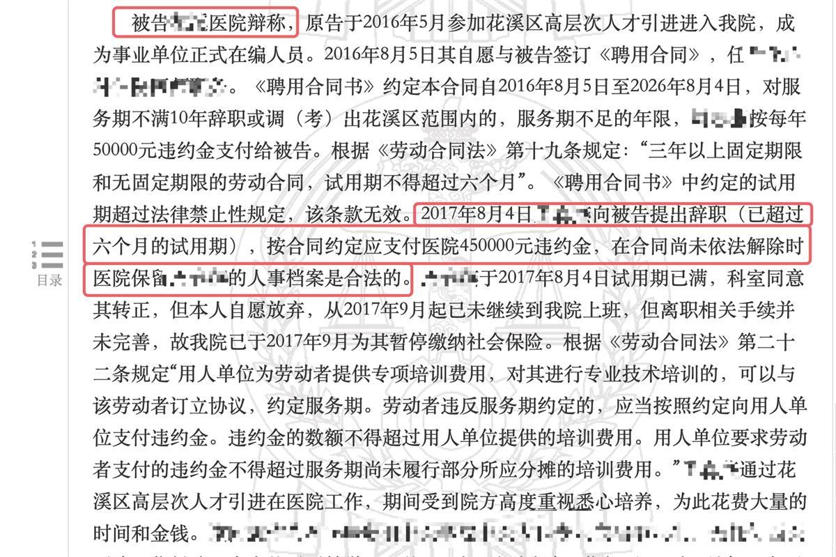极目新闻记者了解到,杨冈遭遇的情况并非个例。中国裁判文书网2018年案例显示,经花溪区人才引进,有劳动者在当地一公立医院工作近一年后提出离职,由于当初合同约定期限为10年,因未满服务年限,被要求先支付45万元违约金,方可办理离职手续。但法院未予采纳,要求用人单位另行主张权利。