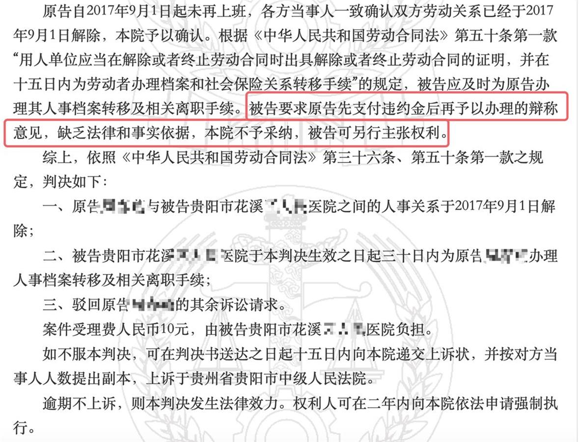 据悉,花溪区还曾有单位让离职员工先交45万元违约金,方可办理人事档案转移及相关离职手续,但法院未予支持。记者获取的一份法律文书显示,经花溪区高层次人才引进,被告花溪区某公立医院(甲方)于2016年8月5日与原告周某某(乙方)签订《贵州省事业单位人员聘用合同书》,合同期限自2016年8月5日起至2026年8月4日止,其中试用期至2017年8月4日止共12月。