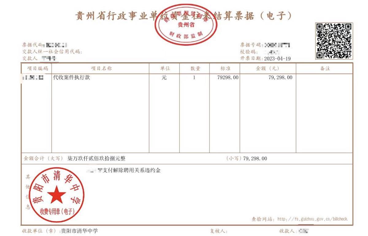 有所不同的是,王语签订的《贵州省事业单位人员聘用合同书》中,服务不足的年限,需要按每年5万元违约金支付。2018年,王语选择回到家乡工作,辞去花溪区某学校教师工作。这也意味着,她要赔偿的金额更高。极目新闻记者获取的一张盖有花溪区某学校财务专用章的违约金支付凭证显示,王语一共支付了3年的违约金,共计15万元。
