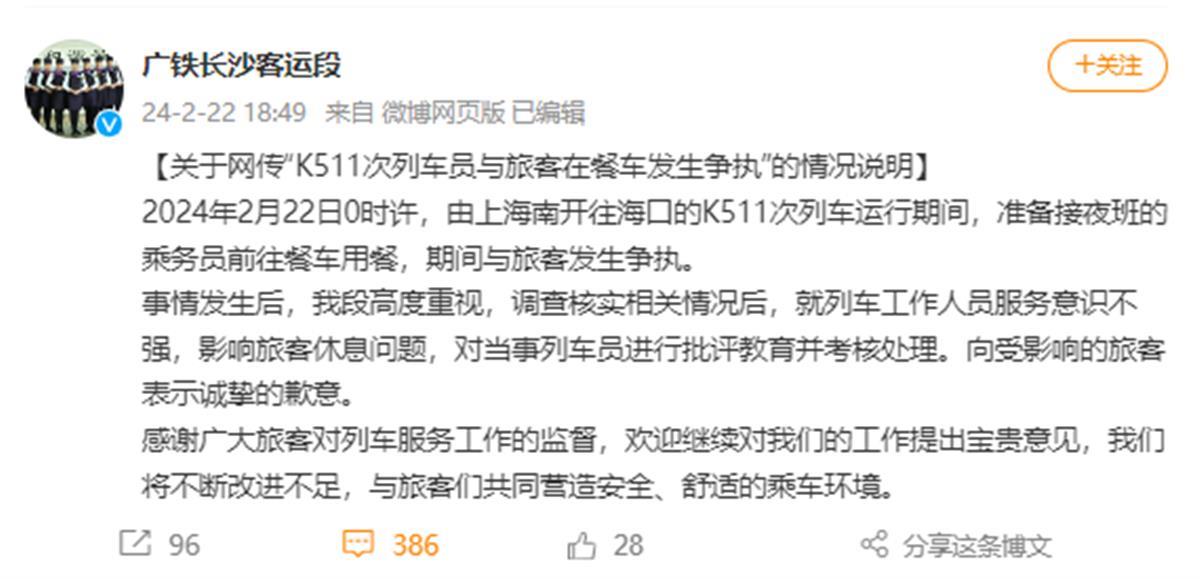 22日晚,针对此事,中国铁路广州局集团有限公司长沙客运段官方微博发布情况说明称:“2月22日0时许,由上海南开往海口的K511次列车运行期间,准备接夜班的乘务员前往餐车用餐,期间与旅客发生争执。事情发生后,我段高度重视,调查核实相关情况后,就列车工作人员服务意识不强,影响旅客休息问题,对当事列车员进行批评教育并考核处理。向受影响的旅客表示诚挚的歉意。”