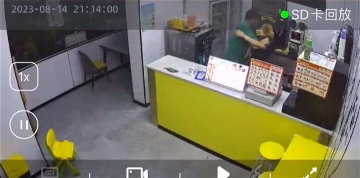 监控视频显示,14日晚,在一家店铺内,坐在收银台的女子随手拿起桌上的东西朝男子扔了过去,男子随后暴怒冲上前,用手掐住女子的脖子,将其放倒在地。