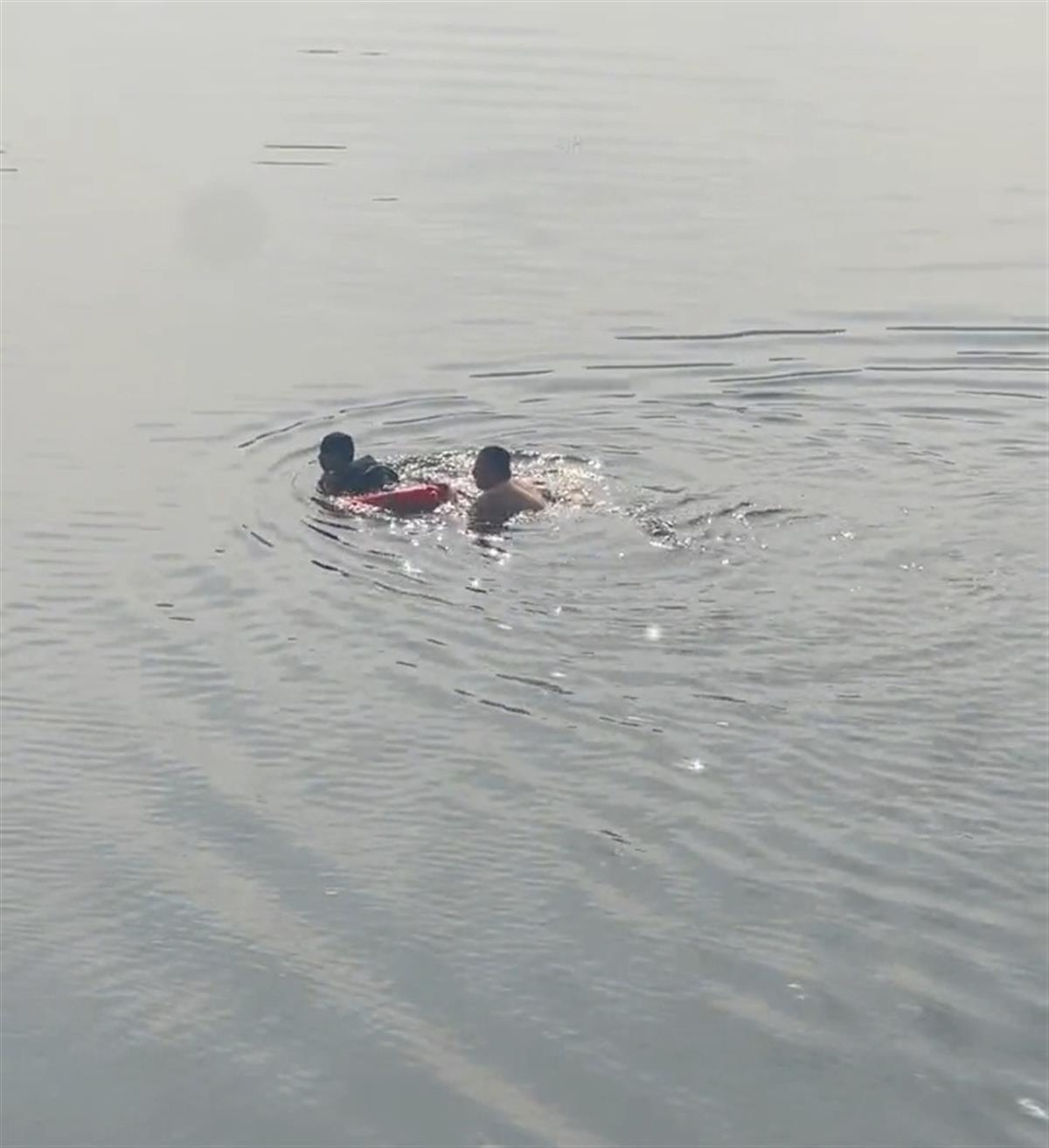 视频显示,一名落水者无助地在水中挣扎,有路人拨打报警电话,一名男子脱掉衣服从桥上一跃而下。男子先在水中拿到救生圈,再游到落水者身边为其套上,随后将其救上了岸。