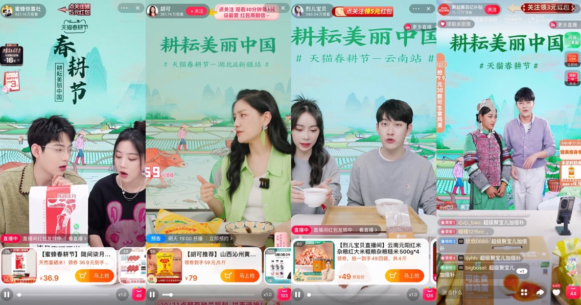 除此之外,蜜蜂惊喜社、胡可、烈儿宝贝、林依轮、叶一茜、百亿补贴官播等主播,通过淘宝直播间的镜头,将广阔的辽河,富饶的土地,原产地的好物,第一时间让消费者看到,在天猫春耕季期间累计直播22场。