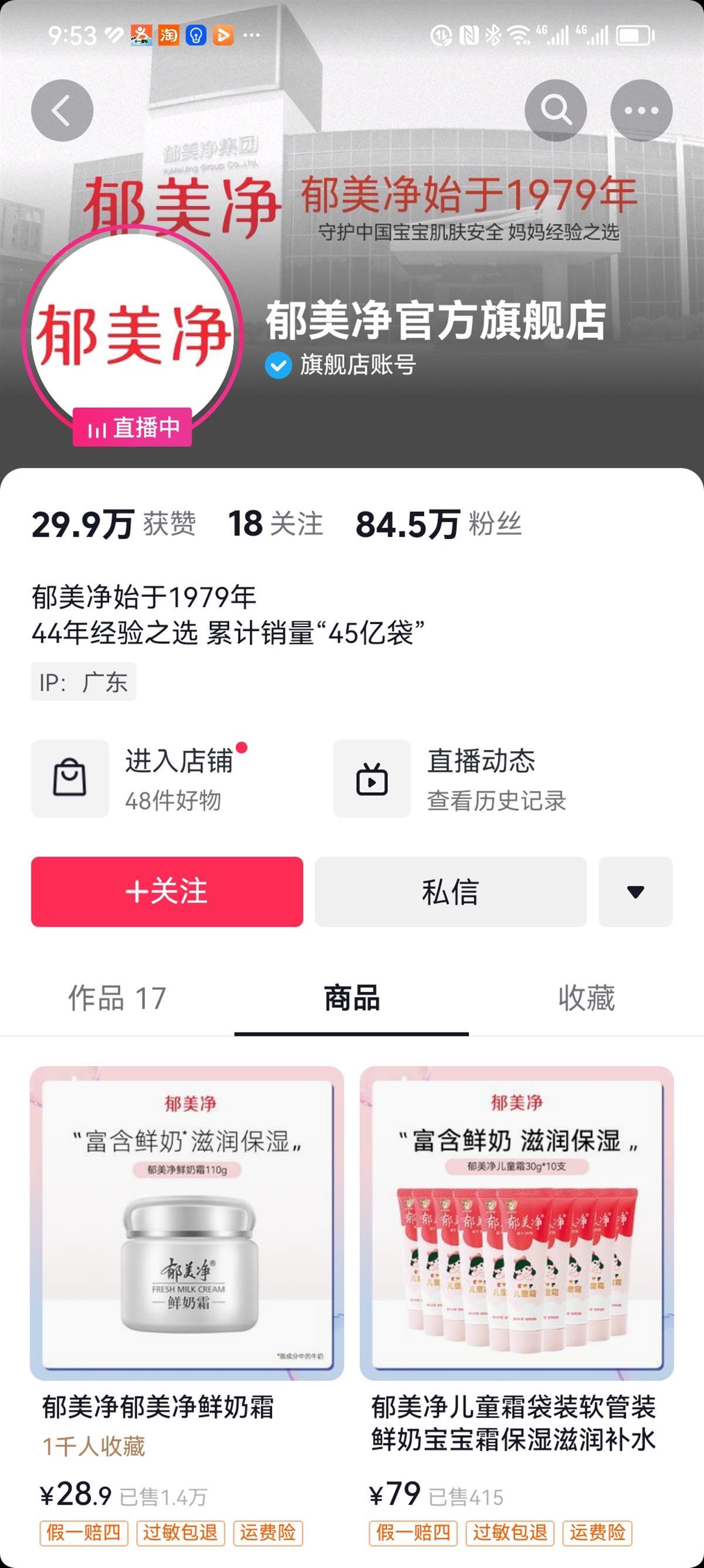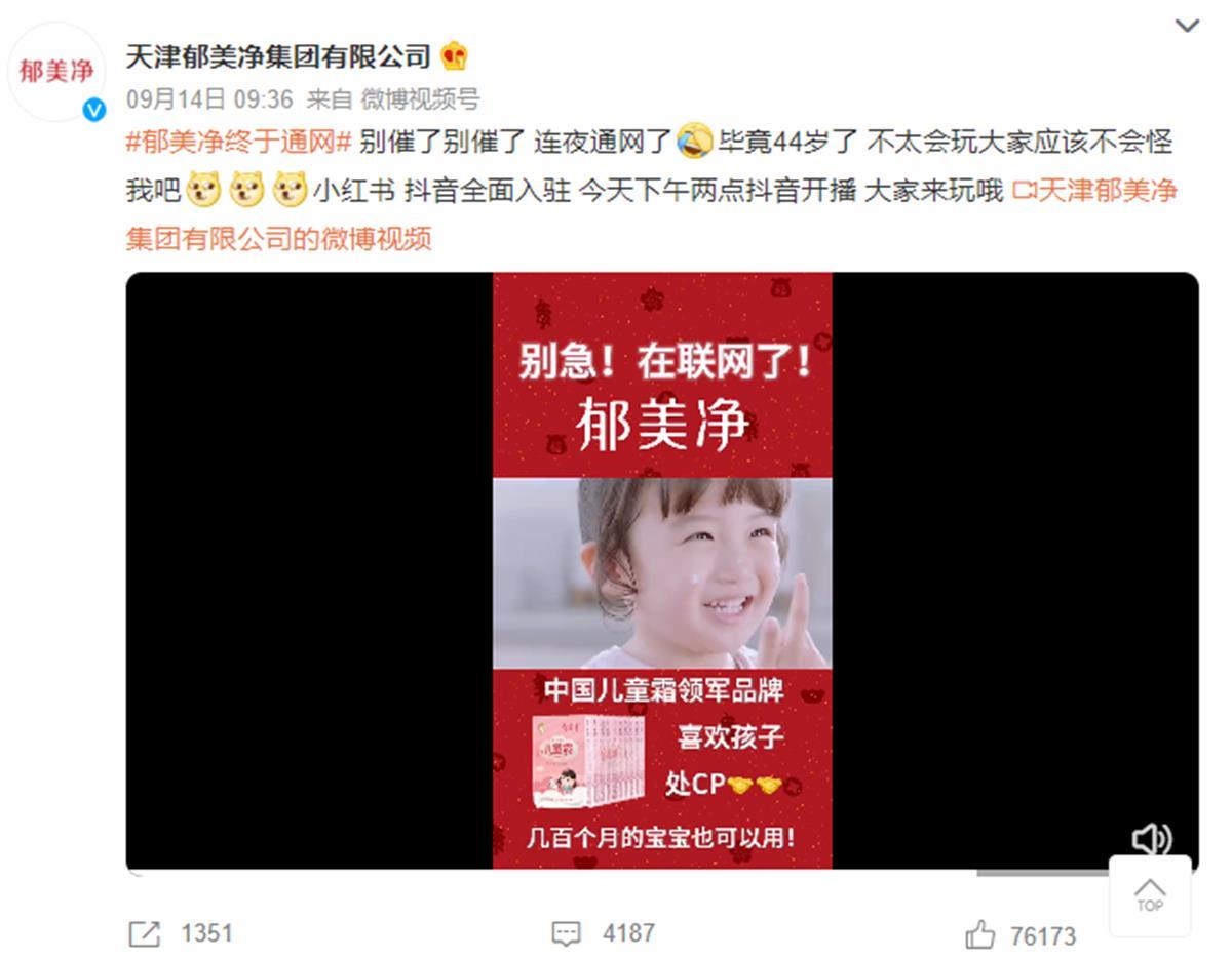 9月15日,郁美净登上微博热搜。9月13日,已有44年历史的国货儿童霜品牌郁美净宣布开通小红书、抖音官方账号,并尝试直播。