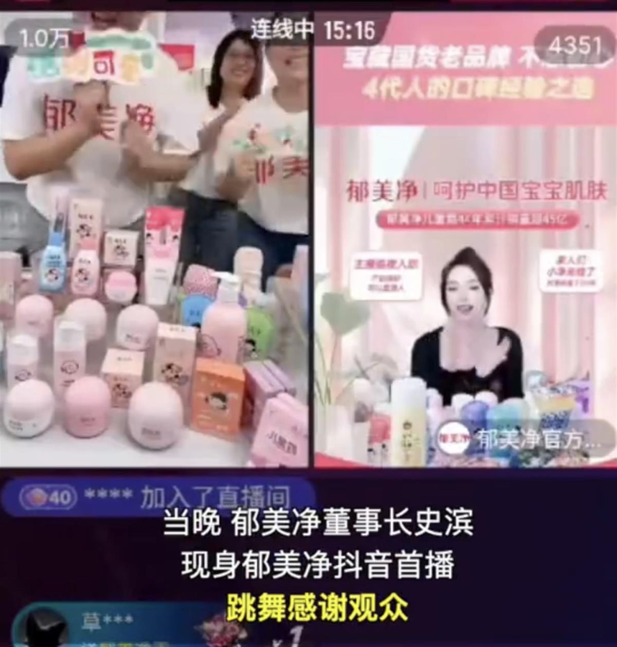 9月14日,郁美净官宣全面入驻各大平台“终于通网”。当晚,郁美净董事长史滨现身郁美净首次直播,跳舞感谢观众。截至9月15日10时,郁美净粉丝已涨至84.5万人。据蝉妈妈数据显示,截止9月14日24时,直播10小时后,销售额为100万元至250万元。
