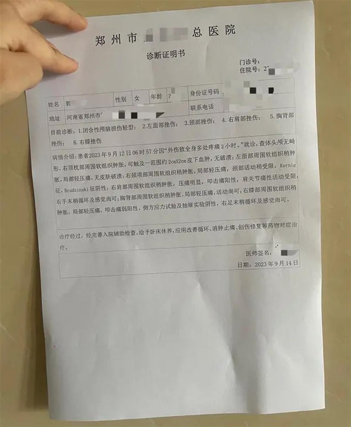 9月15日上午,郭女士的律师、上海申同律师事务所的刘源涌律师告诉华商报大风新闻记者,事发后,郭女士在医院住了3天院。经诊断,郭女士的伤情为:闭合性颅脑损伤轻型;左面部挫伤;颈部挫伤;右肩部挫伤;胸背部挫伤;右膝挫伤。