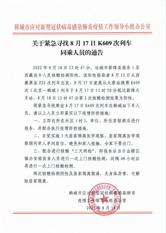 现紧急寻找乘坐8月17日K609次列车在韩城站下车人员。请以上人员立即落实以下疫情防控措施: