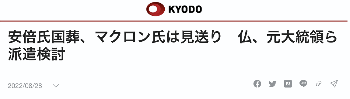 【环球网报道】日本共同社28日报道,多名法国政府相关人士透露,法国总统马克龙计划放弃出席日本前首相安倍晋三的“国葬”。