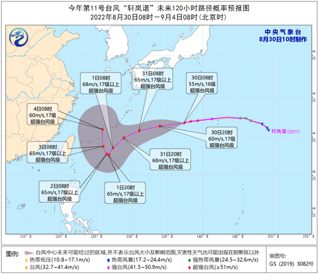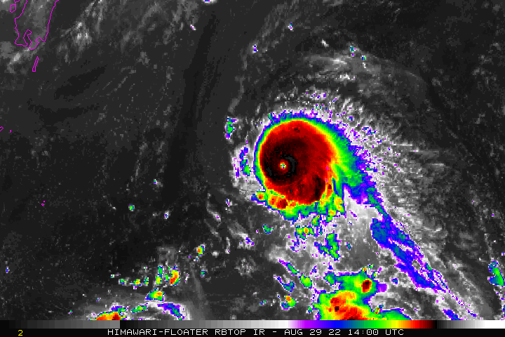 ▲葵花-8号卫星监测到的第11号台风“轩岚诺”云图动画(时间段:2022年8月29日22时00分至30日05时00分)。