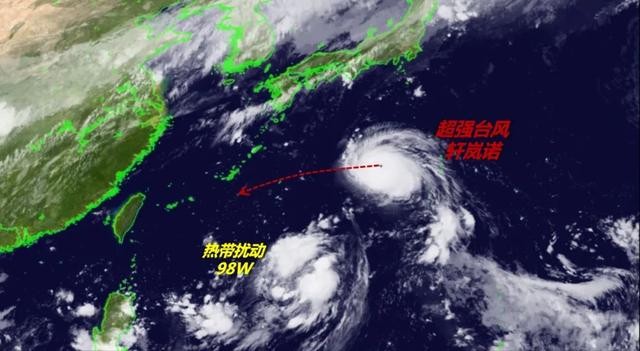 ▲8月30日05时,葵花-8号卫星监测到的超强台风“轩岚诺”和热带扰动98W。