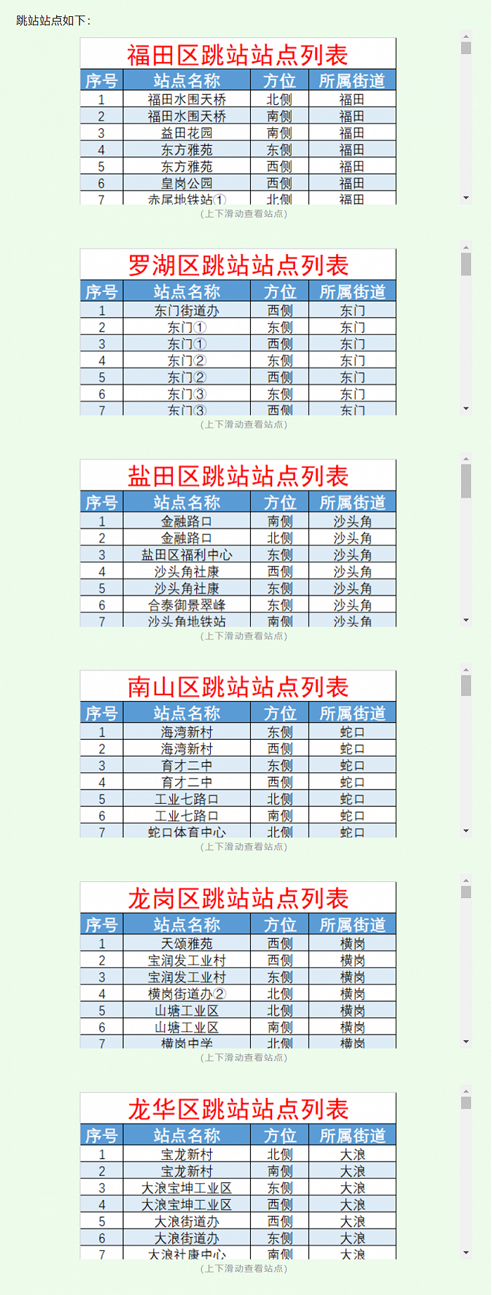 根据福田、罗湖、盐田、南山、龙岗、龙华等区疫情防控指挥部最新通告要求,南园、福保、福田、莲花、东门、桂园、南湖、沙头角、盐田、蛇口、横岗、民治、龙华、大浪等街道的部分公交站点暂停运营,途经公交线路实行跳站运行。