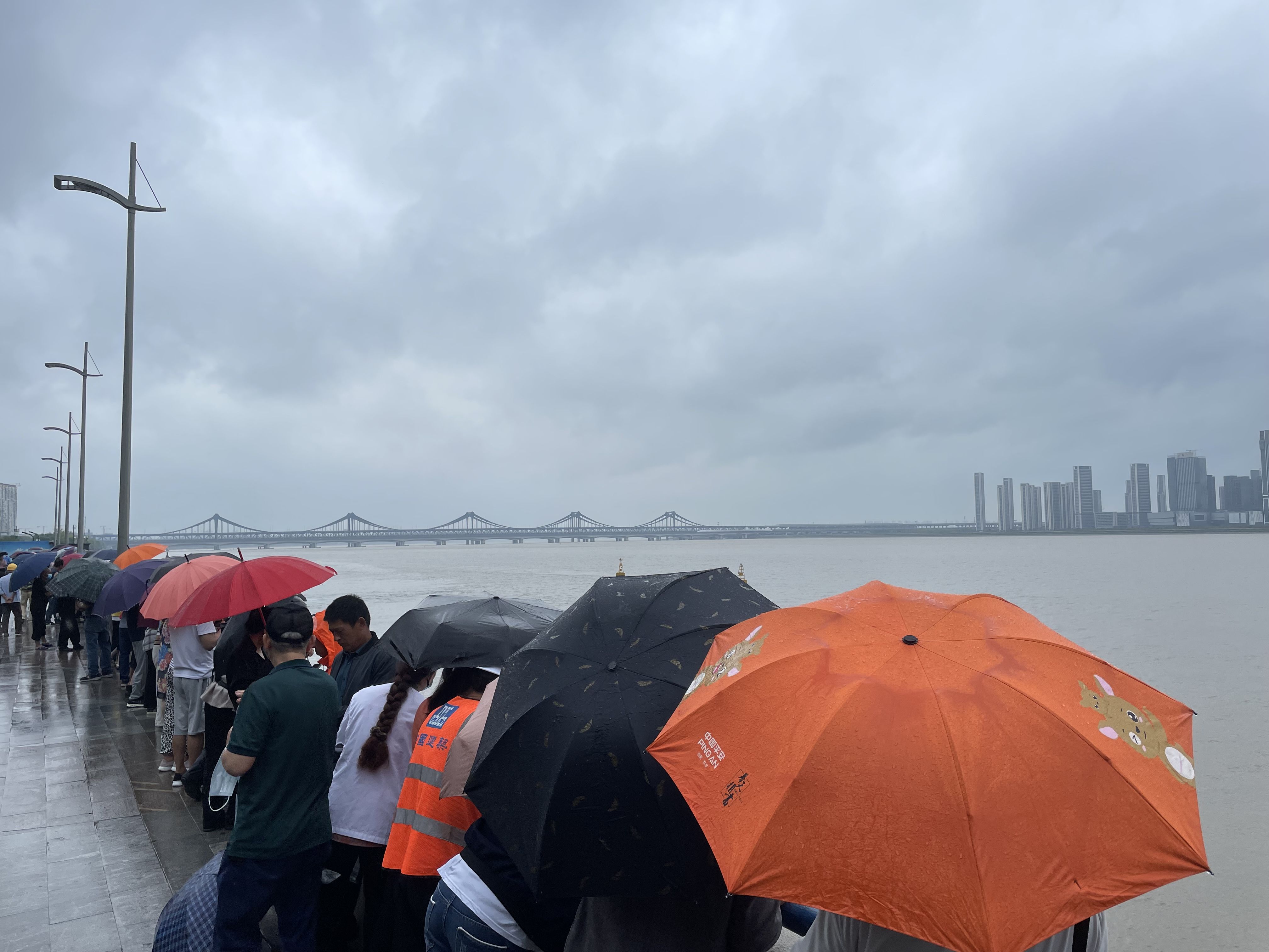 下午三点一刻,钱塘江沿线观潮点已有不少群众在等待观潮。杭州市民崔女士,来杭已有五年,这是她第一次来现场观潮。她说:“第一次来观潮,内心还是很激动的,刚才看到江潮涌过来,我还后退了一下,亲眼所见真的很壮观。”